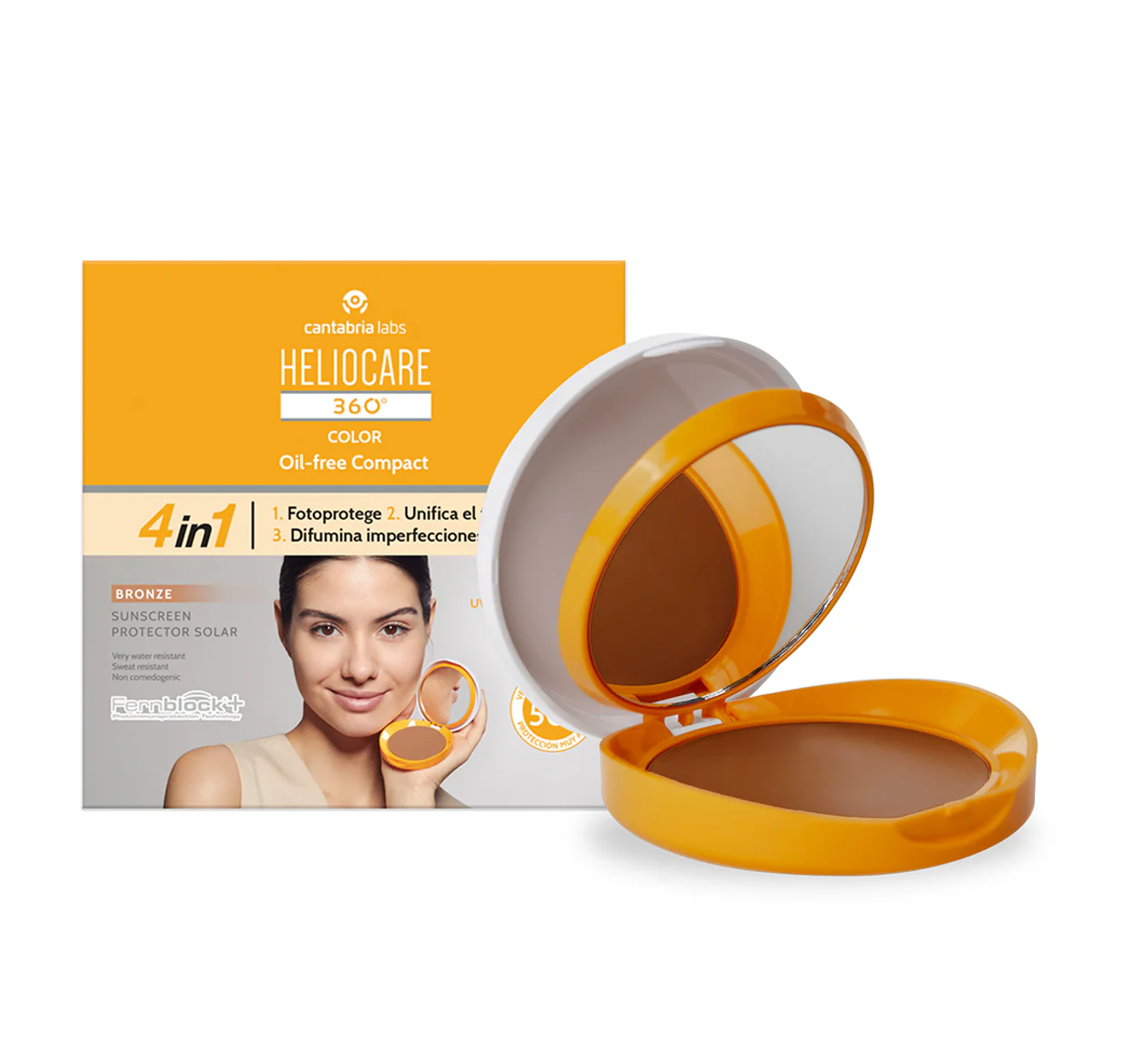 Polvo protector solar SPF 50+. Fotoprotector facial en polvo compacto de amplio espectro (UVB, UVA, LV, IR-A).